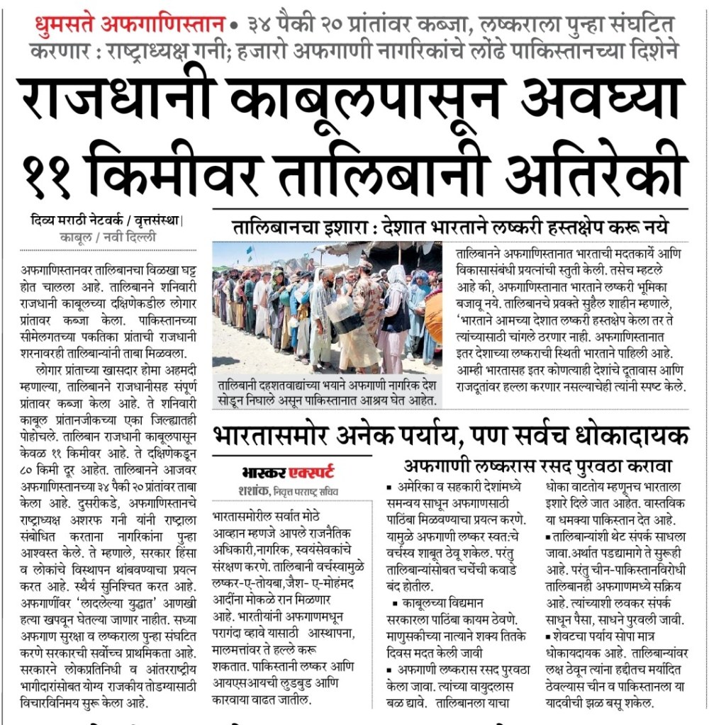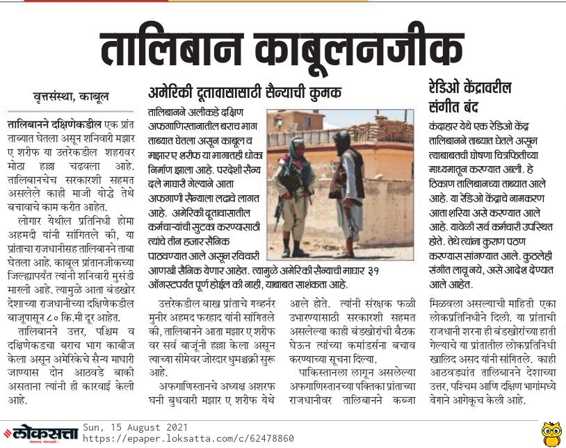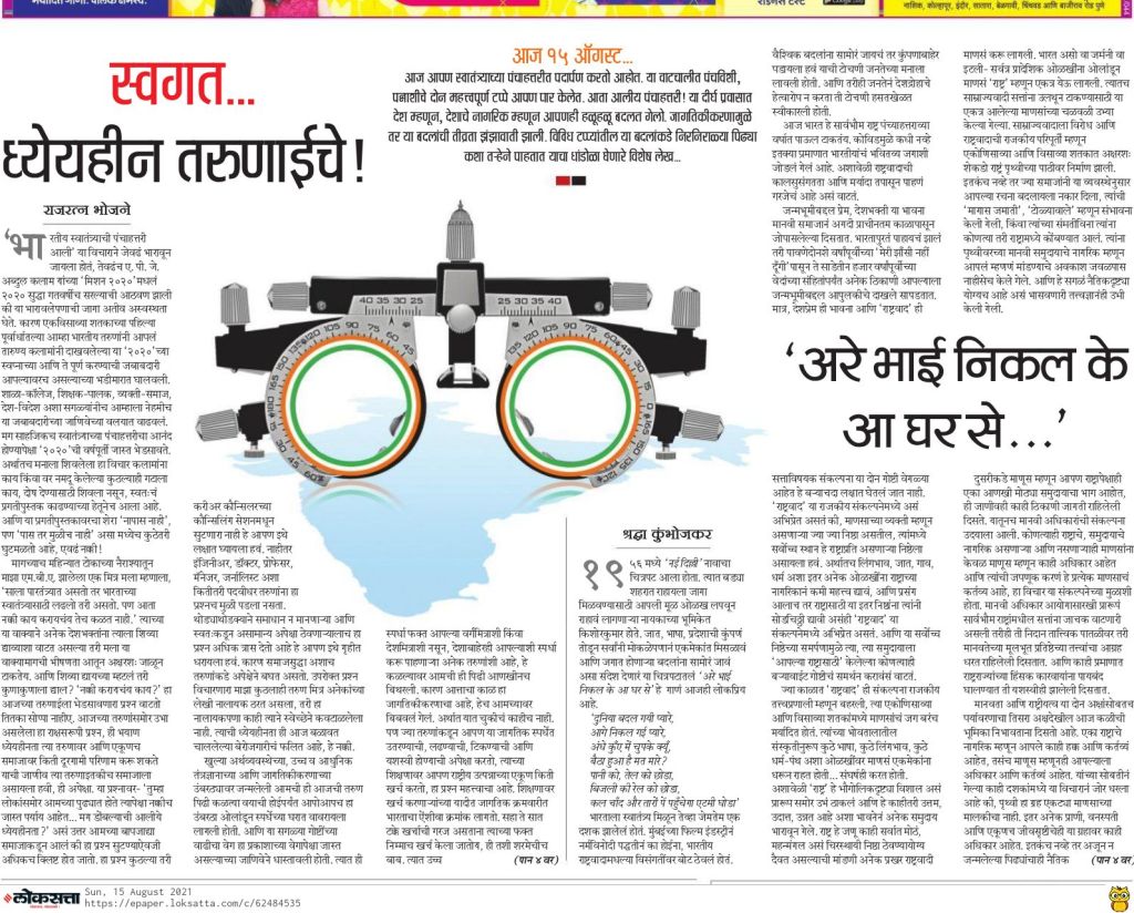 Daily Newspaper Articles 15th August 2021 Posted bythethinkingtreet3August 15, 2021Posted inMarathi Newspapers, newspaperTags:daily newspapers, Daily Sakal, Divya Marathi, lokmat, loksatta, marathi newspaper Share this:Tweet Click to share on WhatsApp (Opens in new window) WhatsApp Click to share on Telegram (Opens in new window) Telegram Click to email a link to a friend (Opens in new window) Email MoreLike Loading... Related Published by thethinkingtreet3 Writing for self enrichment. Brain with knowledge is true empowerment. Nothing is more satisfying than being a student. View more posts